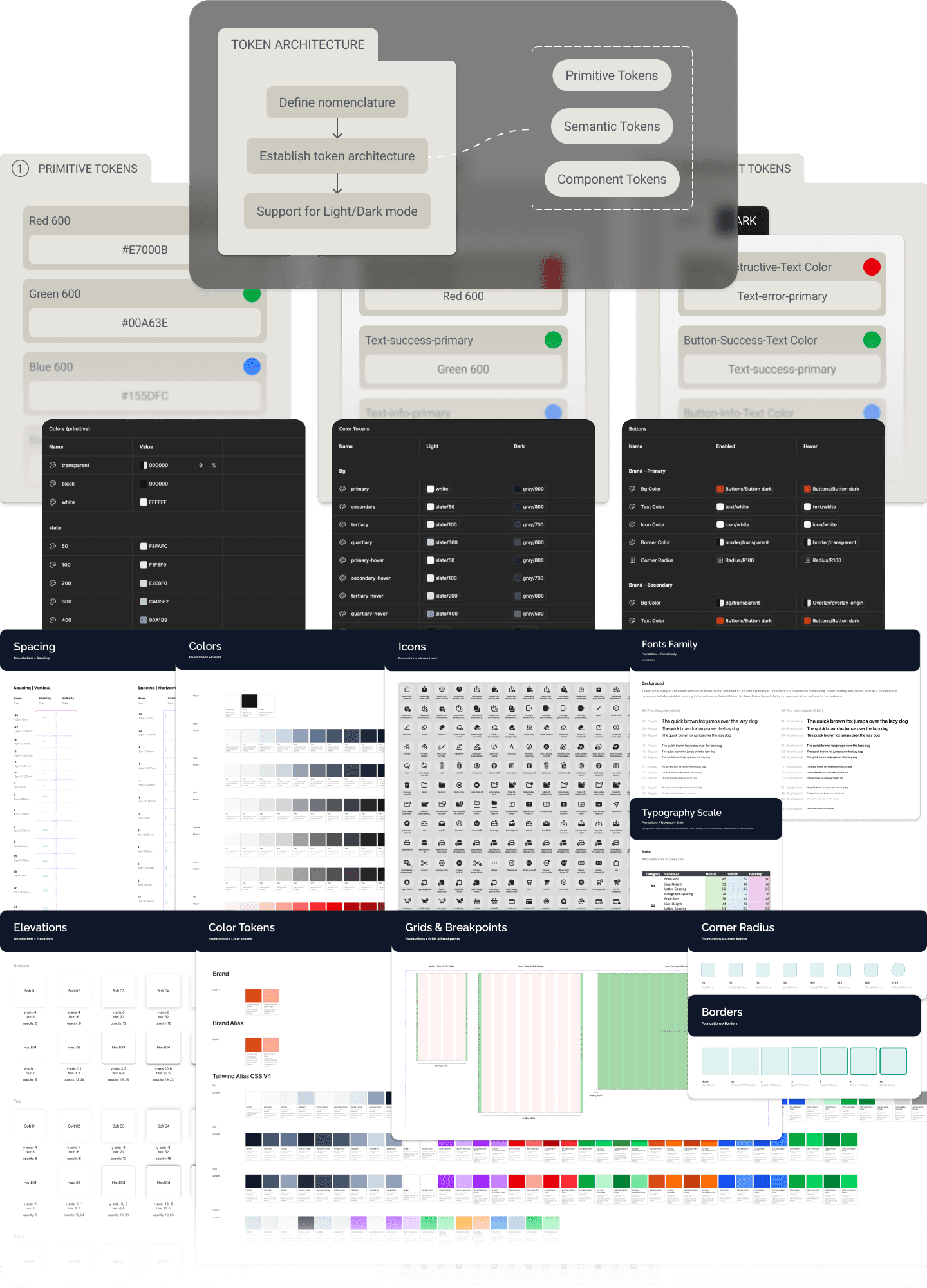 The combination of strong foundations, reusable components, and a three-layered token system enabled designers to create consistent, responsive screens across all required breakpoints.